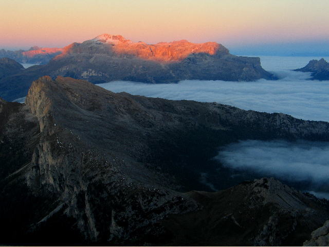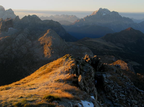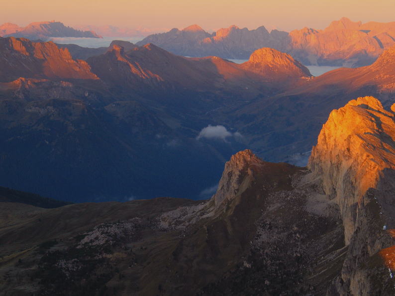 | 1=ラガツォイ小屋テラス西側の絶景。 一つむこうの谷に雲海が流れている。 遥か遠くまで見える快晴の朝。 |