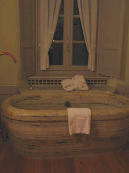 | 2=「私は旅のコーディネーターで、今回は特別ツアーの下見」ということで宿を予約したら、 ロイアルスイートに僕一人で泊まるはめに。 しかも料金は三分の一!!! 部屋は50平米で二つのバスタブがこのような石造りとジェットバス。 どちらも温泉のお湯が使い放題。 一人でお風呂に入るは何だか淋しいので使わなかった。 |