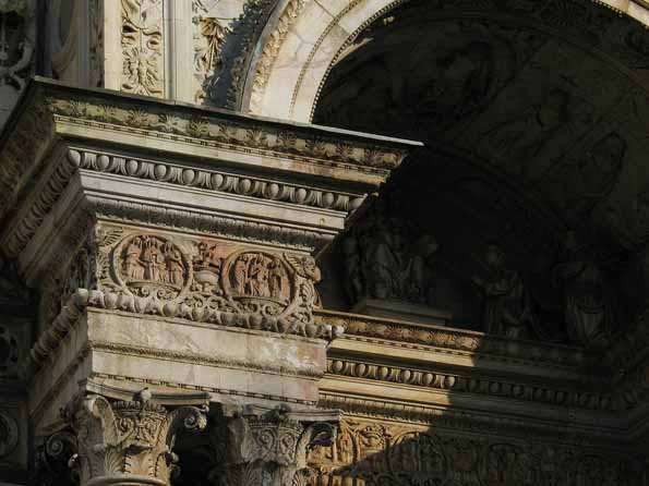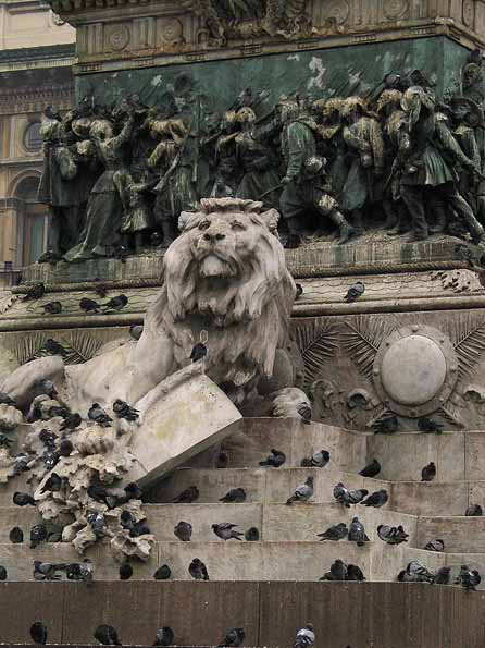 | 8=ミラノに入る。ドゥオーモ広場にて。 鳩に占領されている彫像。 このフンで石像が傷むのです。 ライオンが「臭いよ、まったく!」という顔をしている。 |