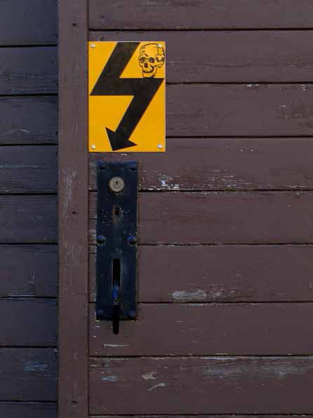 | 7=駅の倉庫の扉の表示、解釈さまざま。 A:鍵穴から覗くとガイコツが見えるよ。(まさか!) B:開けたらいけない!危険がアブナイ!。 (でもこれは文が否定的でイタリア的でないので、言い方を変えないと) 開けたらラクーに行けるよ!はい、どうぞ!。 C:ハイル・ヒットラー!!(何だかガイコツが手を振っているように見えませんか?) それにしても、これだけ怖い扉が半開きになっていたのこそ、怖ーい!。 |