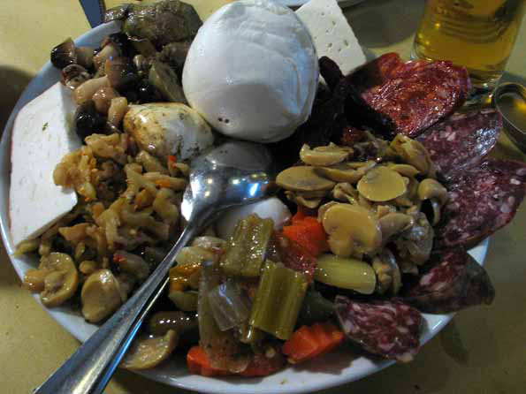 | 9=ナポリ風ピッツァ店の前菜。 チーズ、サラミ、ピクルス、キノコ・・・これにビールでアナタ、テンゴク。 ちなみにこれで一人分ですが、2人でも食べきれなかった。 イタリア人は胃が4つある、とは僕の説。 |