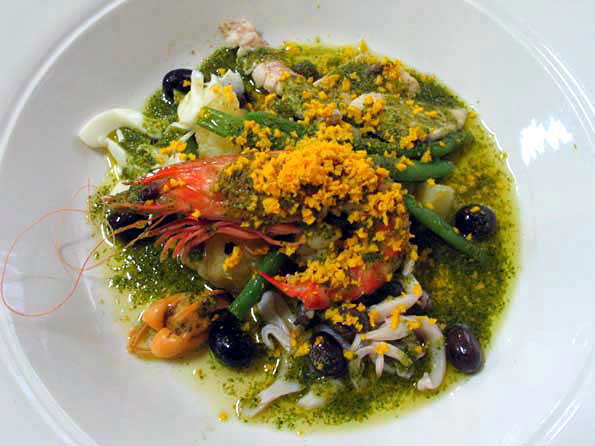 | 10=伊勢エビ、クルマエビ、ムール貝、イカ、それらに家庭菜園の野菜が絡んでいく。 ゆで卵の黄身と白身のはんなりとした甘さが海モノと野菜をうまく調和させている。 グリーンソースのパセリは手切りか、その粗さによってパセリの香りが立ち上ってくる。 色の配置も絶妙。オリーブは後から置いたに違いない。 |