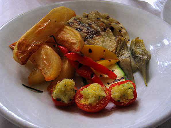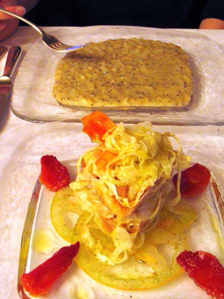 | 14=手前はアペニン山脈の清流のマスを軽く薫製にし、セロリの酢付け、ピーマン等と重ねたもの。 奥は一見リゾットのようだが、地元の絶品ポテトをコマ切れにして軽く火を通し、 パルミジャーノ、白トリュフで味付けした一品。 シャキシャキした歯ごたえに畑の恵みを実感する。 飾り付けは至ってシンプル。素材の実力で勝負だからか・・・。 |