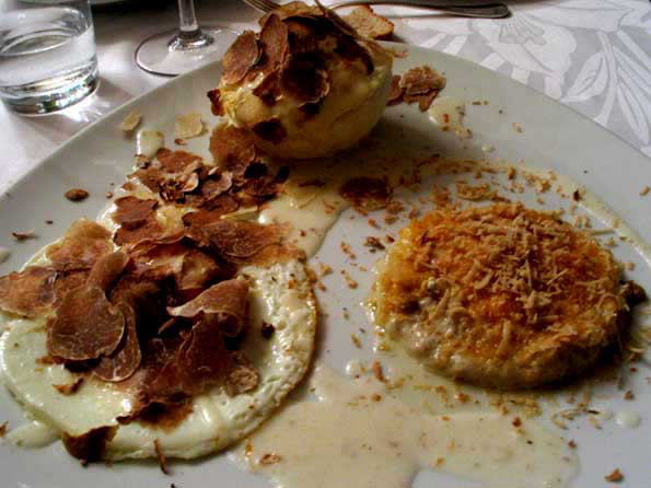 ![]() 100g5万円のそ れを惜しげも無く載せて出てくる。 ナイフを入れる前に荘厳な気持ちになる。 トリュフ自体は食べて も特においしいという訳ではない。 そのものから立ち上る香りに大金を払うのだ。 時間が立つと消え ていくその香りは思い出に似ている。 ああ、人生ははかない・・・切ないほどに感性が震える今夜だ。 飾り付けはクラシックな雰囲気。 以下の2品は、ボローニャ丘陵の村A店。 イタリアでベスト12のスローフードの1店。 |
