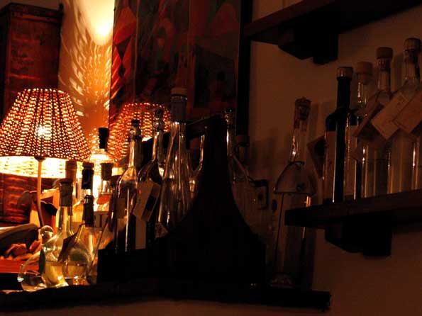 | 15=心和む宵、思い出に残る夕食は、貴方の反対側、 誰がその白い小さな大陸の向こうに居るかで決まる。 (これは僕の持論デス) そしてまた、店の空間がいかに安らげるかというのもポイント。 この写真はボローニャ丘陵の村A店では無いが、 素敵な一角を持ったウンブリア州某店のグラッパコーナー。 意気込まない、さりげなく、しかしセンスあるインテリアというのは結構難しい。 影と陰が大事な役割をしている。 |