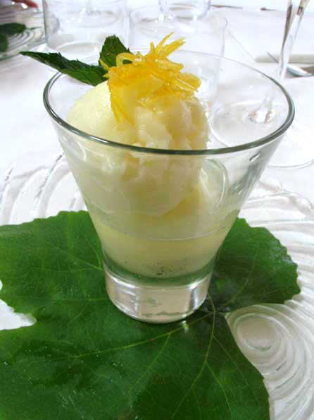 | 16=魚料理の後は、ジンジャーの辛さが効いたシャーベット。 見た目にも爽やかな一品。 ミントの緑に合わせた、下の葉っぱがニクい演出。 |