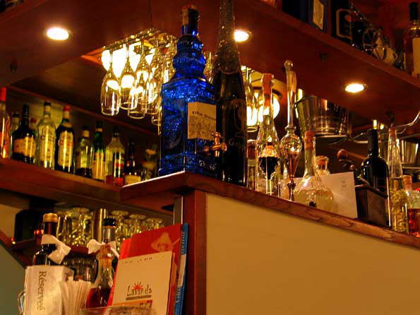 | 18=某店の一角。あそこにああいう青いビンを置くセンス。 試しに、親指で青いビンを隠してみると、このカウンターの主役がこの青さなのだと判ります。 |