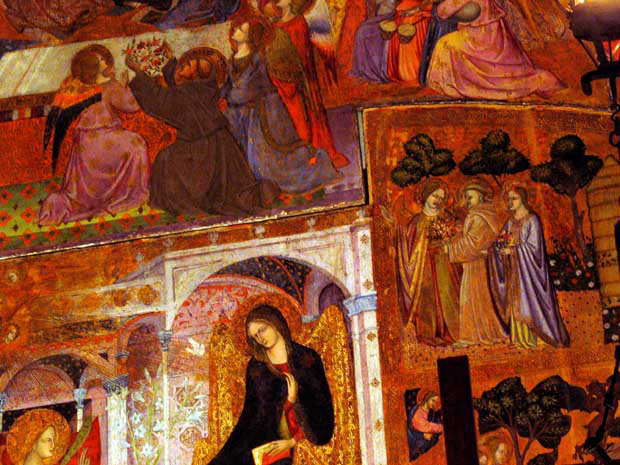 | 4=ゴシック様式の教会内陣のマリア聖祠のイコンなどと共通している。 (アッシジの聖天使教会内の聖キアラ礼拝堂) |