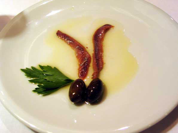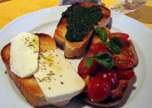 | 7=これを見てヨダレを出す貴方はかなりトスカーナ病が重いですな。 パンの上にイタリア国旗を再現させるのはシャレか? どっちにしてもオイルがウマくないと完成しない前菜です。 よく冷えた発砲白ワインで、チーンとグラスを鳴らしながら目を見交わす。 「今夜は決めてやる夕食」のはじまり、はじまり・・・。 |