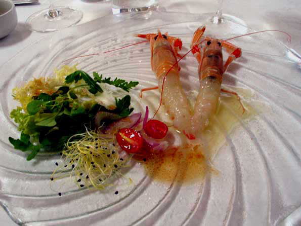 ![]() 手長エビの生に磯の色をイメージさせる野菜付き。 それをうず潮の様な透明な皿で出す。 海の生き物の活発さを感じる色使い。 (アドリア海フェッラーラ郊外) |