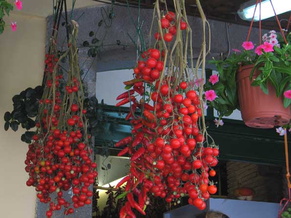 | 5=トマトはかつて「観賞用植物」であった。 海辺の八百屋さんではこうして売っている。 風に乗って特有の香りが流れて来る。 パキーノ産のこのトマトなら、何を作ってもウマくないはずがない。 |