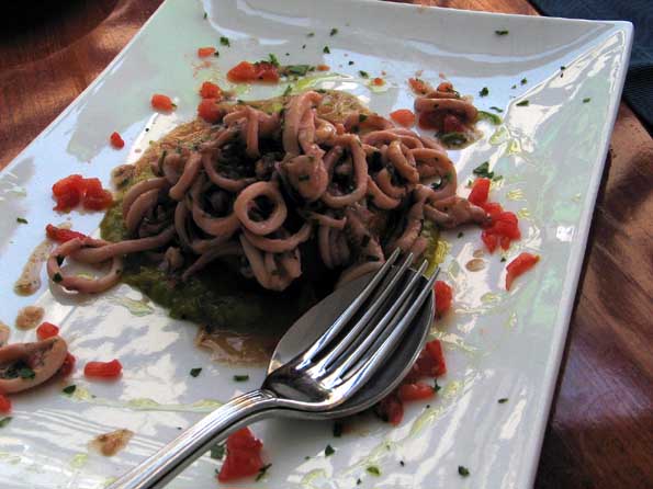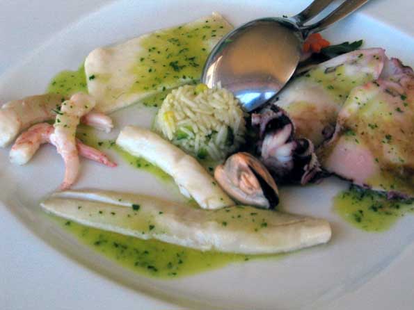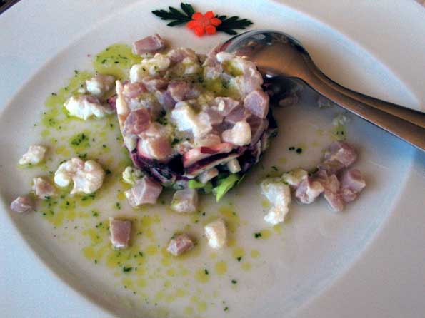 | 6=昼の部。 海岸通りの、誰も入ってない店に飛び込みで入ったらこれがなかなか。 前菜2品。 シェフの感性が光る。 |