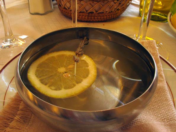 | 10=メインに行く前に手洗い鉢が出て来る。 ラベンダーの花とレモンが入っている。 これが、白い陶器で出て来たら、思わず飲んでしまうかも知れない。 天皇が英国留学中にミスしたのも判る気がする。 |