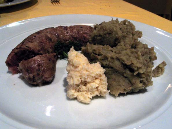 | 15=手造りソーセージ煮にレンズ豆、白大豆。 とてつもなくウマいが、写真に撮ると、どう見てもイヌのウンチ。 皿の盛りつけに一工夫欲しい。 赤いニンジンとか、緑のズッキーニとか。 |