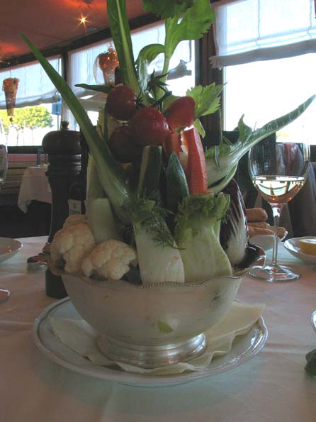 | 16=パドバで出会ったワインのワイナリーを訪ねて商談をまとめ、そのまま魚の店へ。 前菜の野菜サラダが、まるでインスタレーション、さすがイタリア。 緑の長いのが大好物のプンタレッラ。 カリフラワーも生で食べる。 |