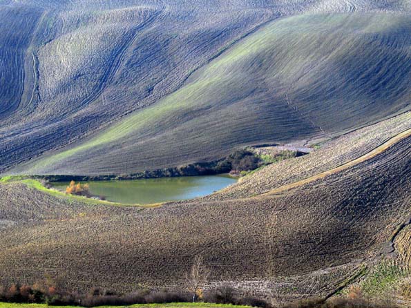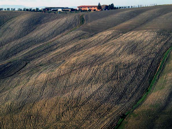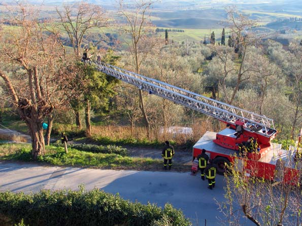 | 22=ピエンツァにて。 丘の見晴し台から地元の人が見ているのは雄大な風景では無く、消防士が枝を切っている様子。 実際に頑張っているのは一人だけで、他の人は何もしていない。 小春日和の暢気な光景。 |