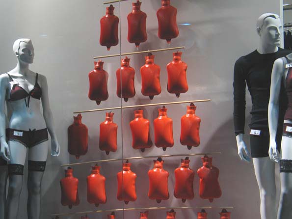 | 24=下着ショップのウインドウ。 年初めに、沢山した行為は、その年にはずっと持続できる・・・という迷信があり、好きな人に赤い下着を贈る風習がある。 つまりは、あれですな、要するに「合体の回数が持続できる」と言うわけです。 こういった歴史的背景をベースに、今時珍しいゴム製ユタンポを並べているが「だから何なんだ?」という疑問が湧いて来る。 間違って、ユタンポと一夜を過ごした人は、その年はずっと寝たきりということか? |
