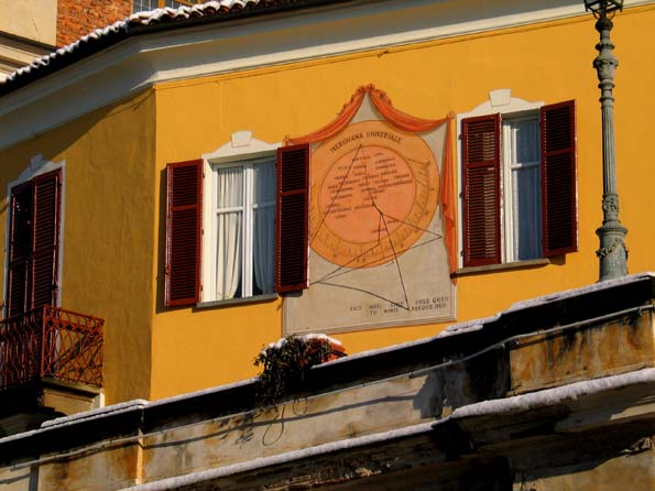 | 4=京都のレストランオーナーのK氏と10日間の試食ツアーに出かける。 スローフード発祥の地ブラの日時計。 同地の有名店Bはウマくなかった。 心がこもってない料理で、食べた後が淋しくなった。 |
