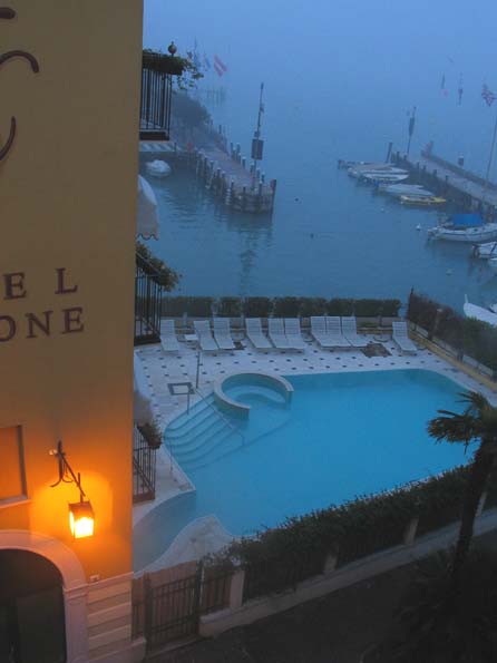 | 5=シルミオーネの朝。霧の中、屋外プールと湖水が静かに明けて行く。 |