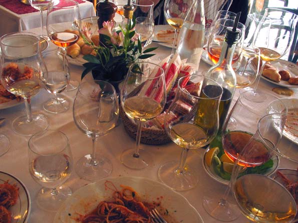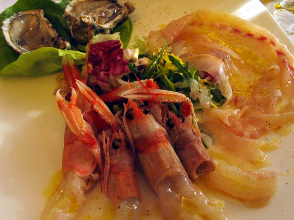 | 7=で、そのままリナルディ社長夫妻と魚料理とスプマンテの絶妙の組み合わせを実体験すべく、昼食に出かけた。 まずは、生カキとか、生エビ、生スズキにどのスプマンテが合うのか、説明を受けながら飲んで行く。 |