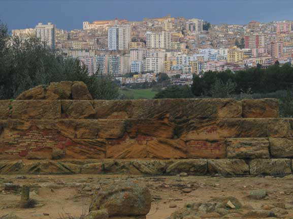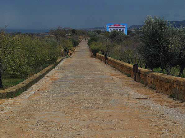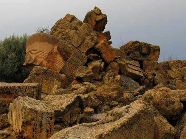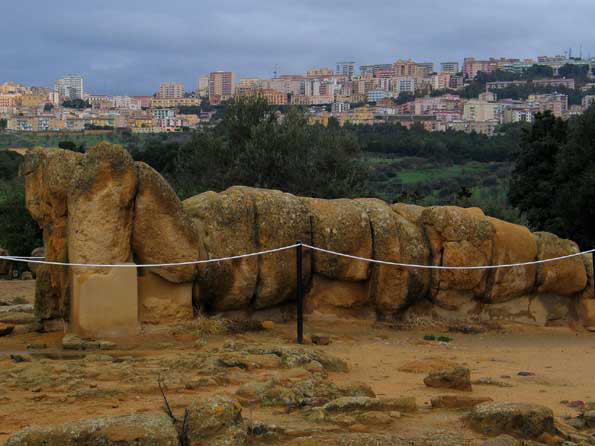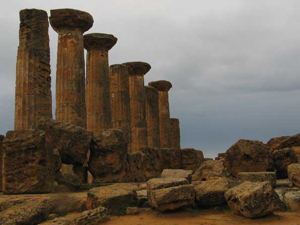 | ヘラクレス神殿。 8本残った太い柱の向こうには、青い海と、低くたれ込めた雲が見えた。 海からこの神殿を眺めたギリシャ人は、恋人や家族に手を振ったのだろうか。 |