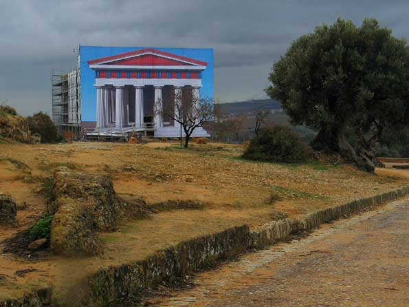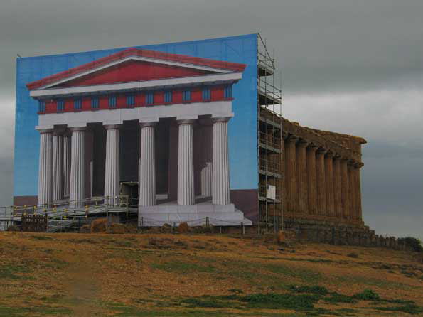 | コンコルディア神殿。 修復中。大きなパネルの絵がユニーク。 これだけ立派なものだったという事実。 |