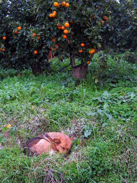 | オレンジの下、草むらで丸まって爆睡中の犬。 幸せの構図。 |