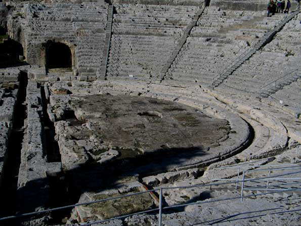 | 紀元前5世紀くらいのギリシャ劇場跡。 山肌の岩を掘り下げて造った、巨大なスリバチ。 2500年前の群衆の熱気と拍手を感じる。 |