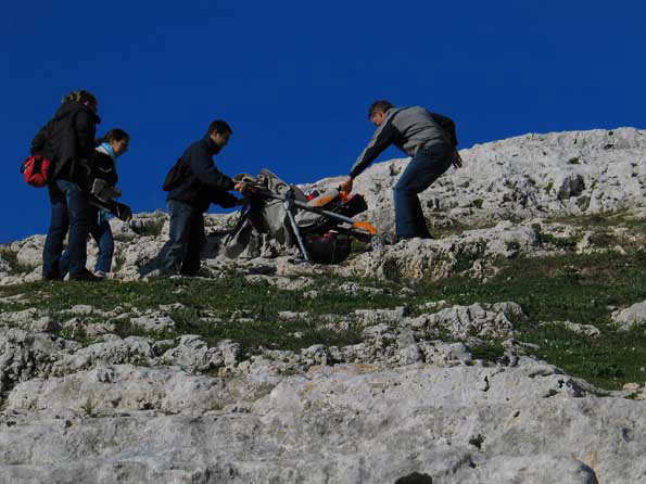 | その劇場跡を見晴らすポイントまで、悪路にもめげず、子供を運び上げ