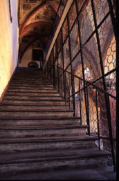 | 8=2階回廊への昇り口。微妙な色が美しい。 |