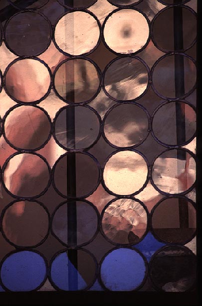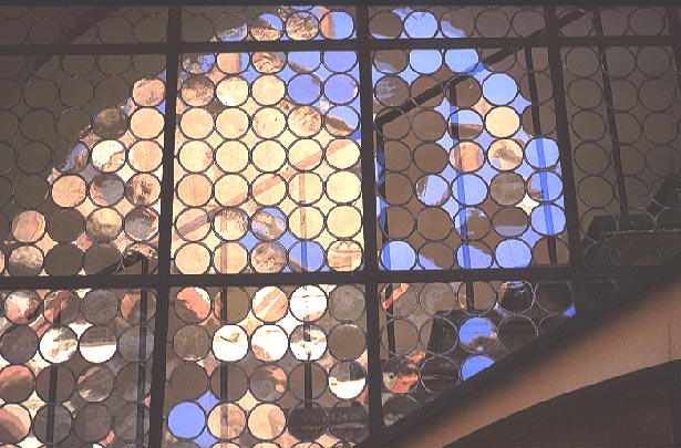 | 13=回廊部のガラス。 ステンドグラスのように繋いである。気の遠くなる作業の結晶。 |