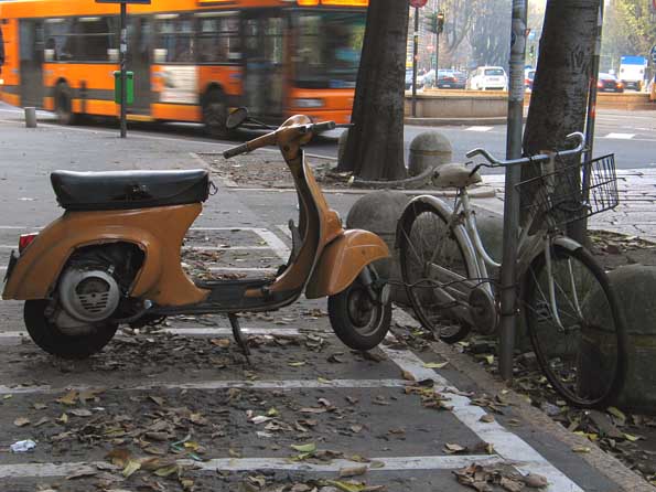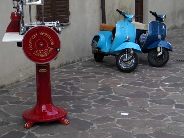 | 2=戦後の機械のシンボル、それは革命的なスクータ・ヴェスパと、 手回しのハム切りマシン。 (パルマにて) |