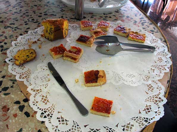 | 7=3星ホテルの朝食、その諸行無常。 この断片の残り方には、「侘び寂び」と言うか、 禅の庭の飛び石的遊び心を思い起こさせる絶妙な配列であった。 余りに完璧なので食べるのを諦めた。 (ペーザロにて) |