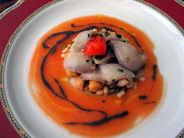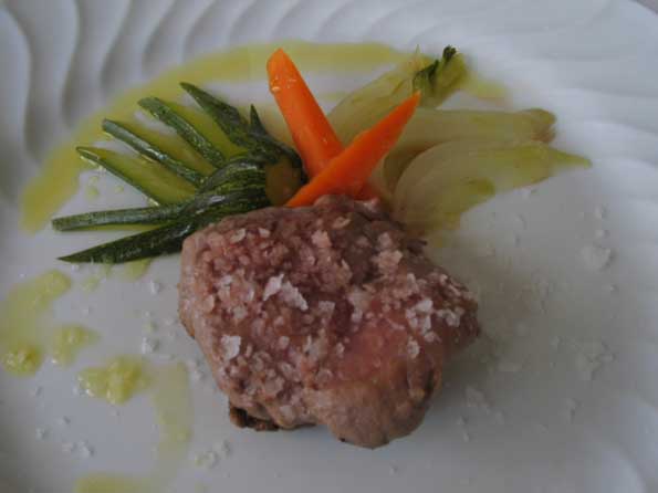 | 16=「シェフは私の妻で、地元オリジナルレシピの、ヒレ肉、塩の華乗せ蒸気蒸しが絶対!」 とオーナーが言うのでお任せ。 微妙な味で驚き。色の配置もかわいい。 |
