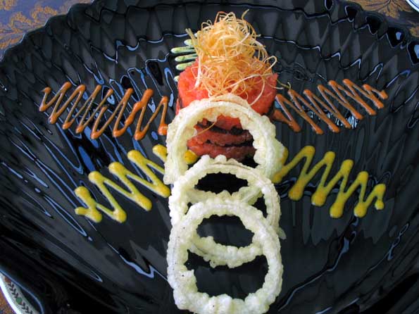 | 11=イワナのミンチをバルサミコ酢浸けのパンで挟んだもの。 それにオニオンリング。ソースはマスタード等。 皿の色に気を使ってオニオンを目立たせ、放射状の構図で視線を絞ることにしている。 |