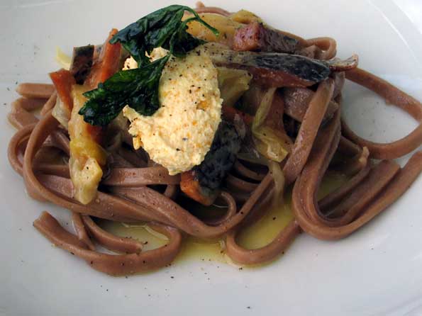 | 12=ほとんどソバに近いパスタ。 薫製した川魚の塩が強すぎて残念。 料理作る人は引き算ができないとね。 素朴な素材を「飾り付けないように飾り付けた」構成。結構難しい。 色即是空、空即是色の心。 |