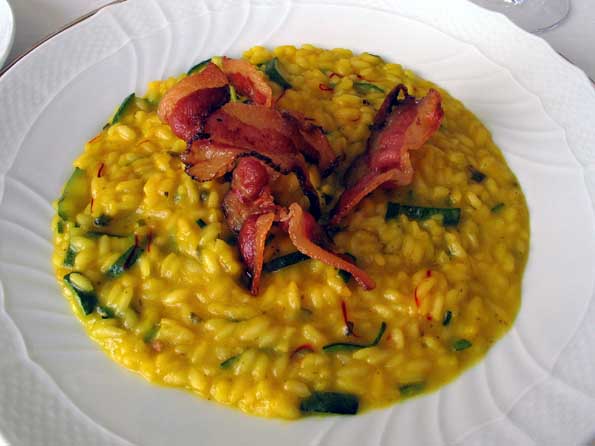 | 15=その翌日、今度はミラノ西の丘陵地帯のレストランへ。 皿はジノリの白。 このリゾットはベーコンのカリカリ感がピッタリで、感心した。 なかなかセンスあるので、この後の展開が楽しみになる。 |