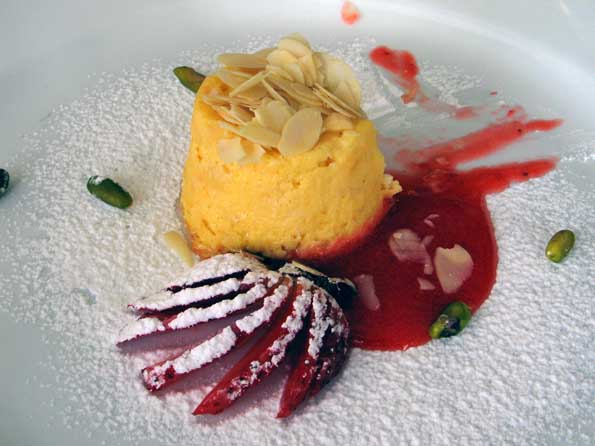 | 18=ジェラート。 三色を押さえた彩りは見事。 食べる前に目で楽しくさせるのは日本料理の基本だが、随分と影響を受けたようだ。 |