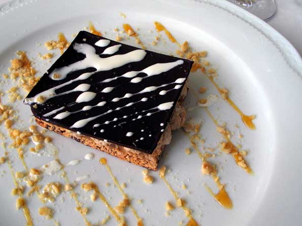 | 19=ミルフィーユの一種。苦いチョコが主役。 縦にかかっているのは地元の蜂蜜。書道的な飾り付け。 何故か花札の「雨、5点札」を連想した。 |