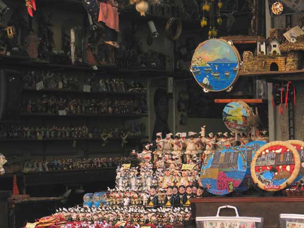 | 4=下街の路地を歩く「スパッカ・ナポリ」に案内する。 1:カバンは前にしっかり持って、 2:スキを見せないで、 3:ボクの指示に従ってください、 とナポリ散策三原則を叩き込んでから出かける。 土産物屋も、全て手作りのものばかり、見ていてほのぼのして来る。 |