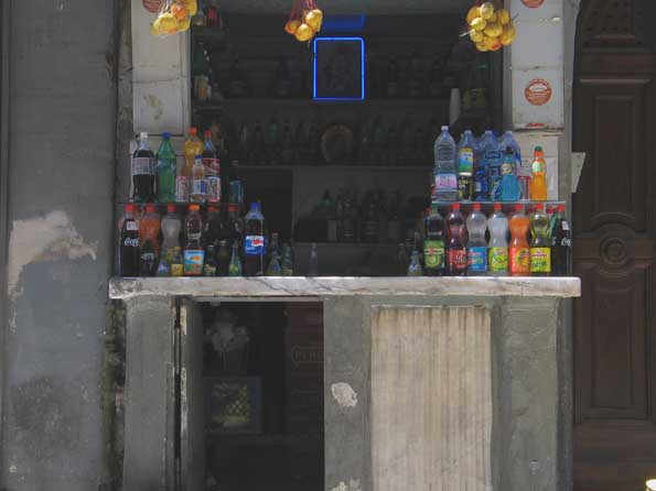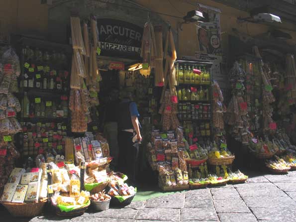 | 8=路上に根を張りそうな食料品店。 イヤー、でもあそこにずっとブラ下げっているパスタは食べたくないなー。 値札なんか雨に当たったのか、波打ってるもんね。 |