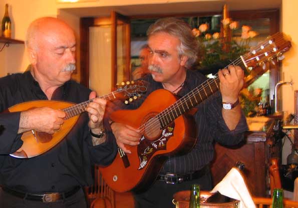 | 15=ピッツア・マルガリータ発祥の店「ブランディ」にて夕食。 この2人がナポリ民謡を果てしなく演奏する。 気持ちよく酔って来る。 ボクも仕事なので思い切り飲めないのが辛いところ。 |