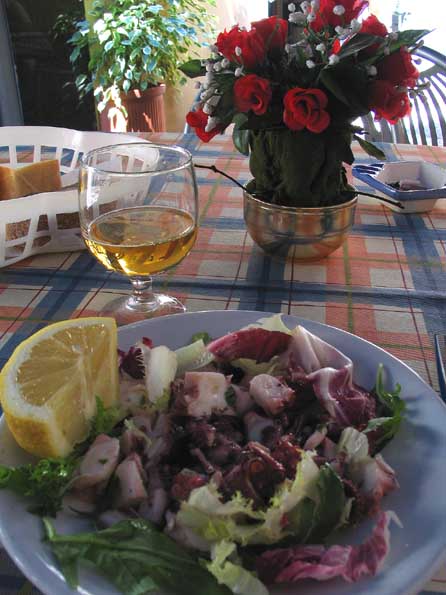 | 18=一人で行った、ナポリのアブナい地区路上の店で、絶品のタコサラダに遭遇。 さっそくオバちゃんにレシピを聞いた。 長くて20分だそうだ、ゆで時間が。 ボクはもう2年ほど1時間15分でトロトロに軟らかいタコを作って来たのでビックリ。 オバちゃんとタコ談義をした昼下がり。 この店のワインのマズさが最高だった。 幸せな時間が流れる。 |