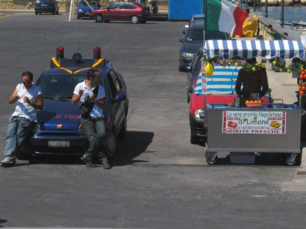 | 20=イスキャ島に渡る前、埠頭でのかき氷屋台。 レモンとかオレンジがうまいので、きっとウマイんだろなー。 いい大人が、仕事中なのにノンビリ食べている。 サボってちゃダメよ。 我々は満腹で、食べられな かったのが残念。 |