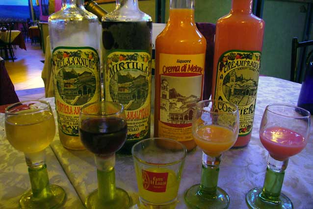 | 地元ボローニャのレストランにて、リキュール飲み比べ。 左からリンゴ、ブルーベリー、レモン、メロン、イチゴのアルコール。 どれが一番ウマいかって?3種類目からは判別不能状態に陥りました。 こういう危険な事はしてはいけません。 |