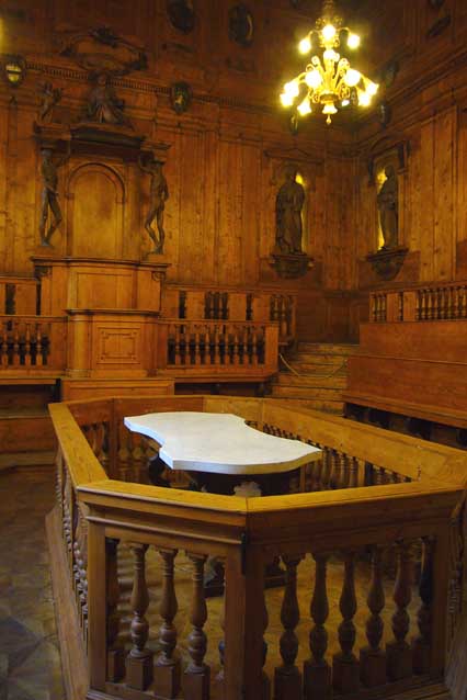 | 900年の歴史を持つ西洋最古の大学の一角、世界初の人体解剖をやったという部屋。 大戦で壊滅的に爆撃されたのを全く同じに再現しました。 その当時の宗教観、世界観を胸に、階段教室に座るとその凄さが判ります。 |