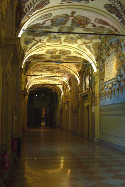 | 大学と言うものが知識の象徴であったころ、ボローニャにはヨーロッパ各国から生徒が集結し、学問の核として活気があった。 その廊下には当時の繁栄が漂っている。 |