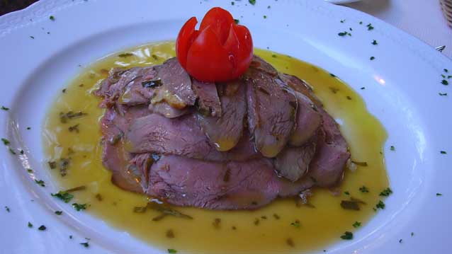 | えーい、また鴨の胸肉だ!夏だからキンキンの白ワインで許してもらう。 ところで、この肉の盛ったのに、赤いトマト・・・次の写真と共通だと思いませんか? 丘に沈む夕日を再現した料理・・・。 私の考え過ぎ? |