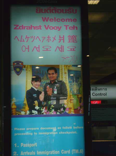 | 追加1=機械据付けのため3回目のタイ出張。 ボローニャからフ ランクフルト経由でバンコクに入り、 入国審査の列に並ぶと、この歓迎 ボードが待っている。 ガーン!「ヘムケツヘァホメ」は、まあ・・・日本語で「ヘムケツ」が ようこそ、「ヘァホメ」がいらっしゃいませ、であろうと無理やりに 推 測するが、そのあとのメチャクチャな文字が、何とも凄い!。 これが、一国の、国際空港の、公式の、歓迎ボードで、しかも堂々と もう2年以上機能しているというのが、信じられる? でもねー、もしかしたらホントの意味は「保険金殺人、気をつけろ」とか 「夜の一人歩き、やっちゃいかんよ」とかの意味かもしれないぜ。 ・・・奥が深すぎる、タイの国!。 |