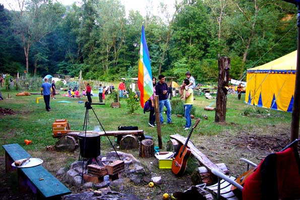 この日は、ボローニャ郊外の路上芸人達の共同体での演奏。 世界各地から集まった、レベルの高い出し物が続く。 会場に入って驚いたのは、この雰囲気!まるで60年代、ウッドス トックそのもの。 「まだこういう人種が残っていたのか!?」と、一気に安らいで行く。 |